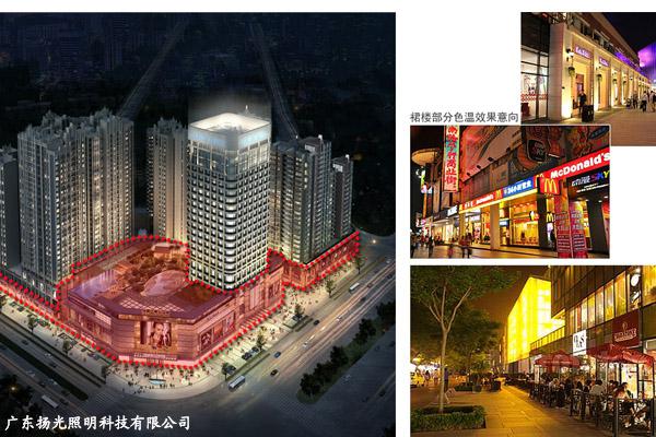 第一亮度區(qū):裙樓部分。裙樓部分多為臨界街店鋪或商廈入口,是聚集人氣的地方,因此需要考慮較高的亮度。此區(qū)域色溫宜選擇柔各的暖色為主色調(diào),各式廣告牌和LED顯示屏為輔,烘托商業(yè)區(qū)的熱鬧,繁華。