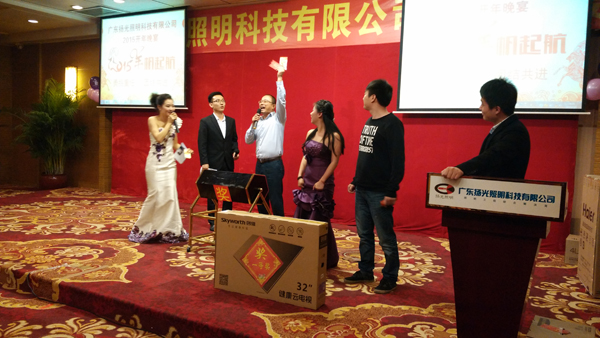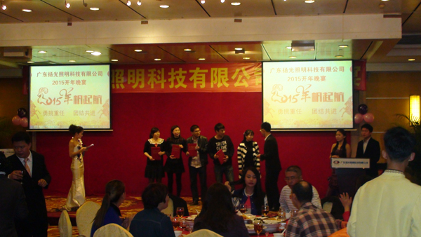 喜悅伴著汗水,成功伴著艱辛,遺憾激勵奮斗,我們不知不覺地走進(jìn)了2015年。在元宵佳節(jié)來臨之際,揚光照明開年晚宴在東莞會展酒店隆重舉行,揚光照明總經(jīng)理李總,全國多個分公司負(fù)責(zé)人、全體員工及員工家屬共同出席。 美味的晚宴中伙伴們與家屬共同觀看了揚光照明給大家?guī)淼墓?jié)目,節(jié)目內(nèi)容精彩紛呈。