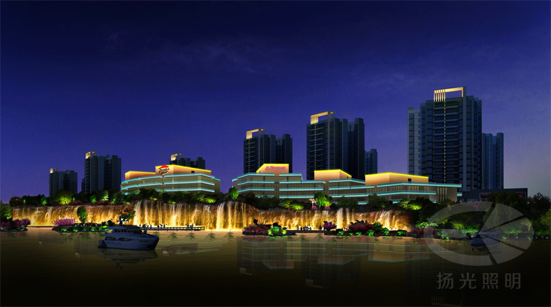 如果是大江大河之類的自然水景,不可能將整個水面點亮,所以主要采取反射岸邊景物,用來凸顯水體的存在和景觀。增加水體的觀賞性,營造夜景的氛圍,一般選用造型別致、隱藏性好的LED作為自然水景的燈具。