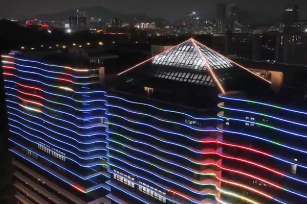 建筑頂部幕墻采用 RGBW 全彩燈光,通過(guò)智能控制,以立面動(dòng)態(tài)圖案與定制動(dòng)畫演繹企業(yè)形象,吸引多視角關(guān)注,深化企業(yè)品牌辨識(shí)度;控制系統(tǒng)設(shè)置平日、節(jié)假日模式,可根據(jù)不同節(jié)日定制專屬光影內(nèi)容,并與廣場(chǎng)噴泉實(shí)現(xiàn)光影聯(lián)動(dòng),營(yíng)造不同的場(chǎng)景氛圍。樓身則以大功率燈光做整體烘托,通過(guò)光影塑造建筑體量,強(qiáng)化空間視覺(jué)存在感。