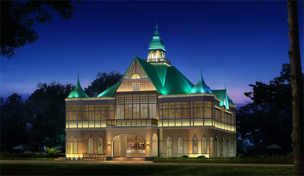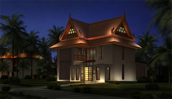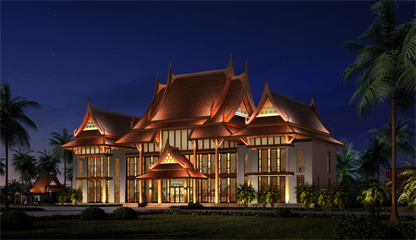燈光的塑造離不開建筑,泰國(guó)館具有鮮明的泰國(guó)佛教文化色彩和傳統(tǒng)的民族特色建筑風(fēng)格。建筑的外墻多以龕窗加以裝飾,與中國(guó)傳統(tǒng)建筑中的木架結(jié)構(gòu)相似,屋頂多為懸山式樣,與我國(guó)傣族地區(qū)的佛殿建筑結(jié)構(gòu)有其相像之處,泰國(guó)、西雙版納就有很多類似建筑。