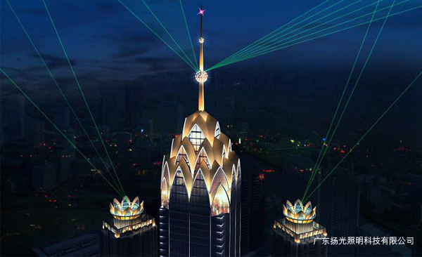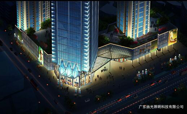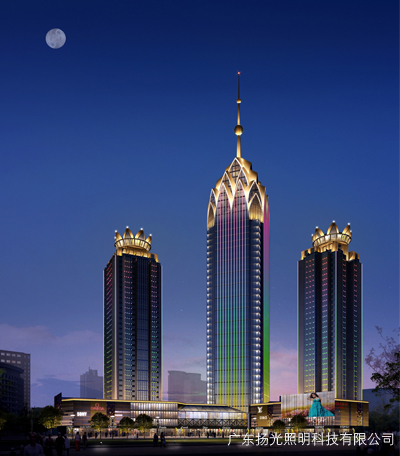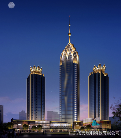 立面燈光主要是連接建筑頂部與商業(yè)裙樓之間的關系,顯示建筑的高大,挺拔的效果。