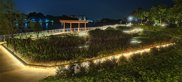 對沿湖景觀進(jìn)行照明,形成統(tǒng)一延伸的湖岸線。在親水平臺外,設(shè)置親水性的發(fā)光燈具,增添一定的游玩觀賞性和趣味性,營造優(yōu)美,和諧的新鄉(xiāng)村環(huán)境。