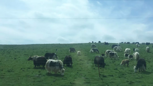 看慣了家鄉(xiāng)的山山水水,這樣毫不掩飾地坦露的自然美景、展示著大自然的本來(lái)面目,無(wú)意間給人一種震憾,一種真實(shí),一種坦蕩;草地上大群的白色山羊和黑色的牦牛低著頭吃草,在這驕陽(yáng)似火的七月,站在海拔3520米的日月山山口,凜冽的寒風(fēng)急掠而過(guò),竟然令人瑟瑟發(fā)抖。下車(chē),在頂峰日月山碑旁大家拍照留念,心曠神怡。