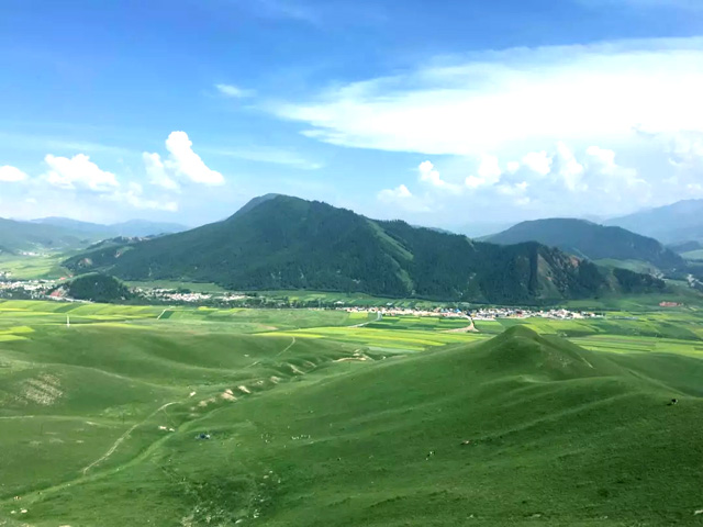 在7、8月份,高山牧場(chǎng)的野花把草原點(diǎn)綴得五彩繽紛,如綢似錦;數(shù)不盡的牛羊膘肥體壯,若隱若現(xiàn);成片的油菜花在湖邊肆意開(kāi)放,藍(lán)天白云映襯下的金黃、嫩綠,打造出一片絕美的曠世風(fēng)景。