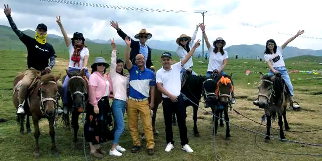 那一望無(wú)際的草原上,濃郁而恬靜的游牧生活對(duì)都市人而言是種久違的夢(mèng)境。河曲彎彎,炊煙裊裊,牛羊悠閑。大家都被眼前的美景所振憾,紛紛擺出各種造型,留下這美麗的一幕。