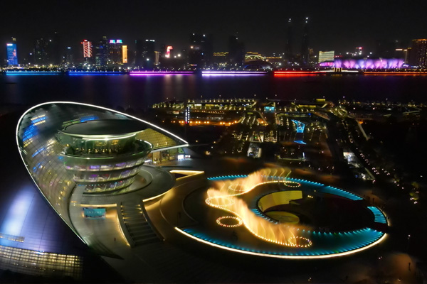 4.水幕 + 激光 + 噴泉聯(lián)動(dòng)秀:水幕作為半透明介質(zhì),配合激光光束、音樂噴泉,在湖面形成流動(dòng)的光影電影;