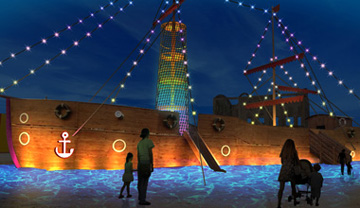 游船碼頭是園區(qū)觀望湖景的最好區(qū)位,視線范圍構(gòu)筑物等通過燈光的提升,增加整體湖岸夜間景觀活力,讓“水、樹、影”在燈光中整合成一體的景觀帶。增加燈光裝置,營造夢幻港灣。