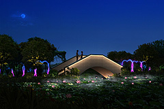 牛郎織女的故事,古典中蘊(yùn)含浪漫,展示了矢志不渝的曲折愛情。采用洗墻燈對橋梁建筑立面洗亮,塑造建筑體的體量感,同時光色選擇暖黃色調(diào),營造鵲橋相會的溫馨、喜悅之情。